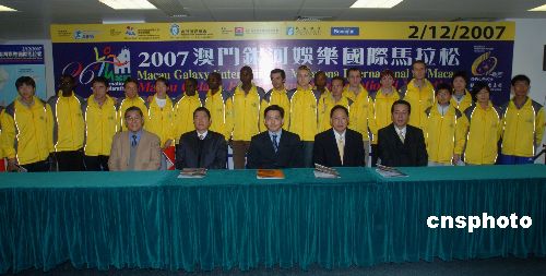 2007澳門銀河娛樂國際馬拉松賽十一月三十日在澳門運(yùn)動場舉行記者會,本屆比賽將于十二月二日舉行。來自各國各地區(qū)及本澳的兩千七百多選手將參加全程馬拉松、半程馬拉松及迷你馬拉松三個(gè)項(xiàng)目的比賽。一年一度的國際馬拉松賽不僅是一項(xiàng)重要的國際體育賽事,已成為澳門市民一項(xiàng)重要的節(jié)慶活動。圖為部分選手在記者會上合影。中新社發(fā) 史利 攝