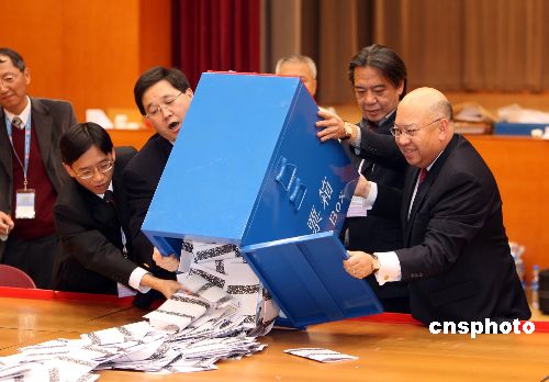 12月2日深夜,香港選管會主席彭鍵基[右]及政制及內(nèi)地事務(wù)局局長林瑞麟[左二]到達(dá)票站,開啟票箱,票站內(nèi)點(diǎn)票工作隨即展開。當(dāng)日,香港立法會港島區(qū)補(bǔ)選共有八名候選人競逐一個議席,分別是:柳玉成、李永健、蕭思江、葉劉淑儀、蔣志偉、凌尉云、陳方安生、以及何來。中新社發(fā) 洪少葵 攝