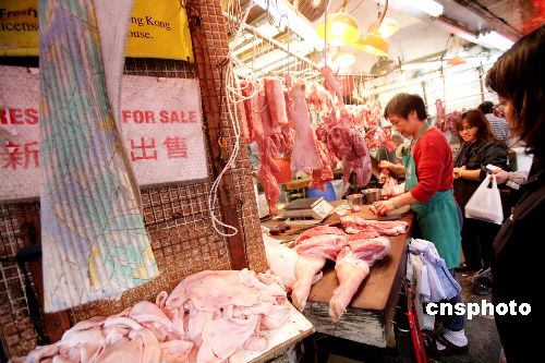12月4日,香港市民如常在街市購買新鮮豬肉。當(dāng)日,香港豬肉總商會表示,五豐行連續(xù)第3日供港豬肉短缺,令部分肉檔要提早關(guān)門。五豐行拍賣的豬肉只是平日的6成半,而活豬的批發(fā)價每擔(dān)上升50至80元,但零售肉價維持不變。中新社發(fā) 洪少葵 攝
