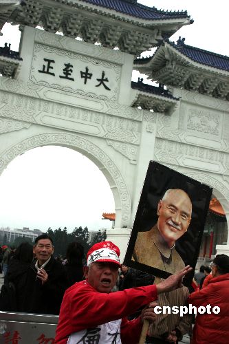 十二月五日,因臺灣教育部門執(zhí)意拆除臺北“中正紀(jì)念堂”牌樓“大中至正”四字引發(fā)的風(fēng)波升級,反對者與支持者在現(xiàn)場爆發(fā)數(shù)波沖突。圖為一位老者舉著蔣介石畫像,對當(dāng)局將要拆牌表達(dá)強(qiáng)烈抗議。中新社發(fā) 董會峰 攝