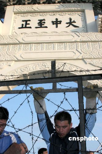 十二月六日,臺北“中正紀念館”在爭議聲中開始封館,“大中至正”牌樓將要拆除。圖為當天下午,臺灣當局調(diào)派的警察在門前設置拒馬。中新社發(fā) 董會峰 攝
