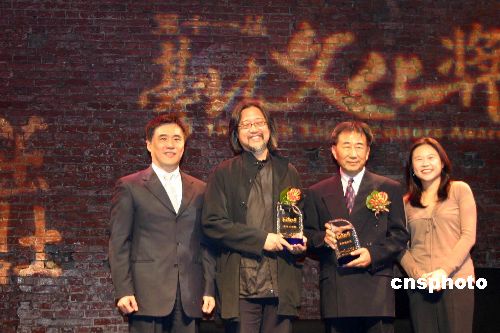 十二月七日,在臺(tái)北市著名的老劇場(chǎng)——紅樓劇場(chǎng),第十一屆“臺(tái)北文化獎(jiǎng)”在這里頒發(fā)。賴聲川先生創(chuàng)辦的“表演工作坊”以及“耕莘實(shí)驗(yàn)劇團(tuán)”創(chuàng)建人黃英雄獲得本屆大獎(jiǎng)。圖為臺(tái)北市長(zhǎng)郝龍斌、臺(tái)北市文化局局長(zhǎng)李永萍與獲獎(jiǎng)?wù)吆嫌。中新社發(fā) 陳國(guó)華 攝