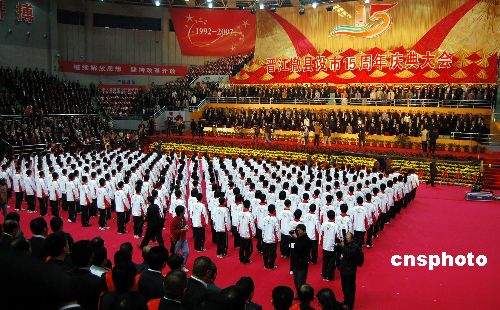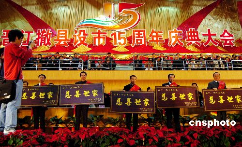 十二月八日, 福建晉江撤縣設(shè)市十五周年慶典大會(huì)在晉江市祖昌體育館隆重舉行。中央、福建省、泉州市領(lǐng)導(dǎo),香港、澳門(mén)、臺(tái)灣地區(qū)晉江鄉(xiāng)親社團(tuán)代表,菲律賓、新加坡、馬來(lái)西來(lái)、印尼、緬甸等國(guó)家的晉江鄉(xiāng)親慶賀團(tuán)及晉江各界人士共三千八百多人參加了慶典大會(huì)。中華海外聯(lián)誼會(huì)等五十多個(gè)單位發(fā)來(lái)賀電賀信。在慶典大會(huì)上,晉江市政府表彰了捐資晉江慈善事業(yè)實(shí)際到款千萬(wàn)元人民幣以上的慈善世家、五百萬(wàn)元人民幣以上的慈善家和三百萬(wàn)元人民幣以上的慈善大使。中新社發(fā) 傅丹丹 攝