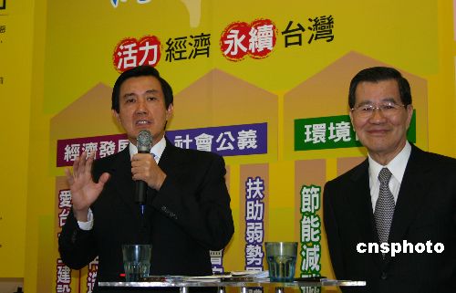 十二月十九日,國民黨二00八參選人馬英九及其搭檔蕭萬長聯(lián)合發(fā)布了《臺(tái)灣經(jīng)濟(jì)新藍(lán)圖之二·產(chǎn)業(yè)再造及全球連結(jié)報(bào)告》。中新社發(fā) 陳國華 攝