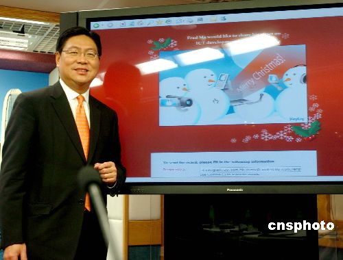 12月21日,香港商務及經濟發(fā)展局局長馬時亨主持2008年“數碼21”資訊科技策略新聞簡報會。馬時亨即場發(fā)送電子賀咭予各個傳媒機構,祝愿圣誕節(jié)快樂。中新社發(fā) 鄧慶樂 攝