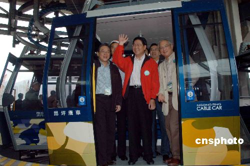 12月22日,香港商務(wù)及經(jīng)濟(jì)發(fā)展局局長(zhǎng)馬時(shí)亨(中)早上試坐昂坪360纜車,馬贊賞纜車有改善,又說坐得很放心,呼吁市民及游客都應(yīng)該來坐纜車。中新社發(fā) 譚達(dá)明 攝