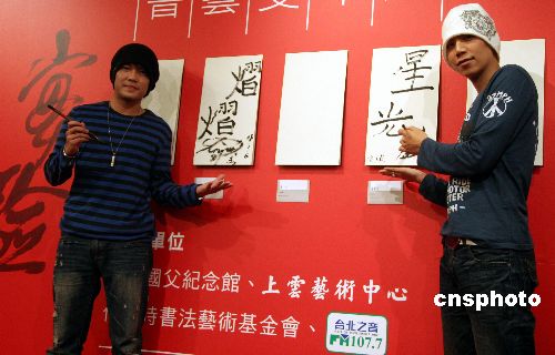 臺灣當(dāng)紅藝人“星光二少”潘裕文、許仁杰在臺北“傳統(tǒng)與實驗書藝雙年展”開幕式上現(xiàn)場揮毫,為展覽捧場助興。