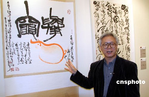臺灣知名書法家林章湖介紹參展“實驗”書法作品。