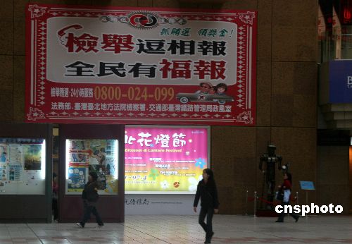 一月七日,距臺灣第七屆“立委”選舉投票日只有五天,選戰(zhàn)日趨激烈。臺灣檢方也加強抓賄選的街頭宣傳,圖為臺北火車站售票大廳內(nèi)懸掛的檢舉抓到賄選可領(lǐng)獎金的巨幅廣告。中新社發(fā) 陳立宇 攝
