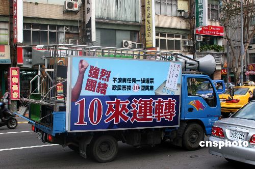 一月七日,距臺(tái)灣第七屆“立委”選舉投票日只有五天。選戰(zhàn)日趨激烈。圖為行駛在臺(tái)北街頭,兩邊掛著競(jìng)選文宣,前頭安著兩個(gè)擴(kuò)音喇叭,邊開邊廣播的流動(dòng)宣傳車。中新社發(fā) 陳立宇 攝