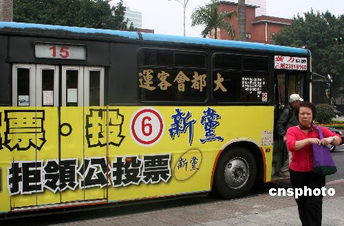 圖:臺公交車上刊登新黨“拒領(lǐng)公投票”廣告