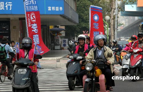 一月十日,距離臺灣“立委”選舉日只有兩天,臺北選戰(zhàn)進入白熱化。圖為一名“立委”候選人的選務團隊,將拉票彩旗插在摩托車上穿梭于臺北街頭造勢。中新社發(fā) 孫自法 攝