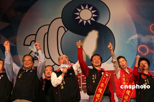 1月11日晚,中國國民黨在臺(tái)北縣三重市綜合運(yùn)動(dòng)場舉辦“2008臺(tái)灣轉(zhuǎn)運(yùn)之夜”活動(dòng),為國民黨參加本屆“立委”選舉作最后沖刺。中新社發(fā) 孫自法 攝
