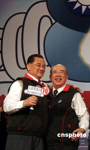 中國國民黨榮譽(yù)主席連戰(zhàn)(左)與國民黨主席吳伯雄共同為國民黨參選“立委”打氣、助威。
