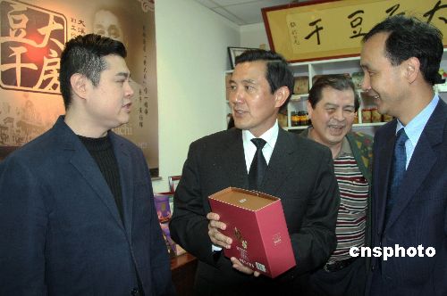 豆干老店店主黃建嘉(左)贈馬英九紀念豆干。