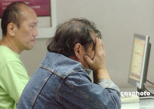 一月二十二日,受環(huán)球股市下挫影響,港股急挫二千零六十一點二三(2061.23)收市,創(chuàng)歷來最大點數(shù)跌幅。圖為當(dāng)日股民在銀行關(guān)注行情,對股市表現(xiàn)極度無奈。中新社發(fā) 鄧慶樂 攝