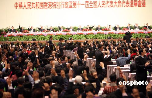 一月二十五日上午,第十一屆港區(qū)人大代表選舉在香港會(huì)展中心舉行。會(huì)議由選舉主席團(tuán)常務(wù)主席曾蔭權(quán)主持,大會(huì)表決通過梁振英為總監(jiān)票人及另外22名監(jiān)票人。中新社發(fā) 洪少葵 攝
