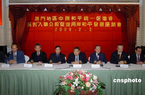 二月二日,澳門地區(qū)中國(guó)和平統(tǒng)一促進(jìn)會(huì)在萬豪軒酒店舉行“反對(duì)‘入聯(lián)公投’,促進(jìn)兩岸和平發(fā)展”座談會(huì)。專程來澳門的臺(tái)灣新黨主席郁慕明主講了“兩岸關(guān)系發(fā)展的形式和前景”,與會(huì)各界人士也紛紛表達(dá)了反對(duì)“入聯(lián)公投”,促進(jìn)兩岸和平發(fā)展的心聲。中新社發(fā) 史利 攝