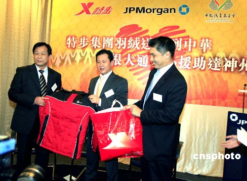 風(fēng)雪無(wú)情人有情,中國(guó)大陸南方雪災(zāi)繼續(xù)牽動(dòng)眾多同胞的心。二月四日,中國(guó)運(yùn)動(dòng)服裝品牌特步國(guó)際向雪災(zāi)嚴(yán)重地區(qū)江西省捐贈(zèng)五千件總價(jià)值人民幣二百萬(wàn)元的羽絨服,協(xié)助災(zāi)民疏緩眼前困境。圖為特步國(guó)際董事長(zhǎng)丁水波(中)、中國(guó)扶貧基金會(huì)副秘書(shū)長(zhǎng)楊青海(左)、摩根大通亞太地區(qū)股本資本市場(chǎng)主管吳繩祖出席香港的捐贈(zèng)儀式。中新社發(fā) 王麗南 攝