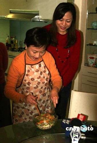 新春將至,臺(tái)灣二00八年“大選”國民黨副參選人蕭萬長的夫人朱俶賢(左),二月五日下午在友人家中做拿手菜“十全十美”,向民眾祝賀新年。中新社發(fā) 徐長安 攝