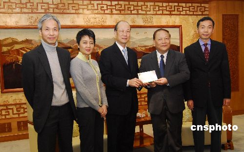 二月五日,梁安琪董事(左二)代表澳門博彩股份有限公司遞交捐善款五百萬澳門元(澳門博彩股份有限公司行政總裁何鴻燊博士兩百萬元,蘇樹輝博士(左三)五十萬元,吳志誠董事(左一)五十萬元,澳門博彩股份有限公司兩百萬元)救助內(nèi)地遭雪災(zāi)同胞。澳門中聯(lián)辦主任白志健(右二)接受善款并代表災(zāi)區(qū)人民表示感謝。中新社發(fā) 史利 攝