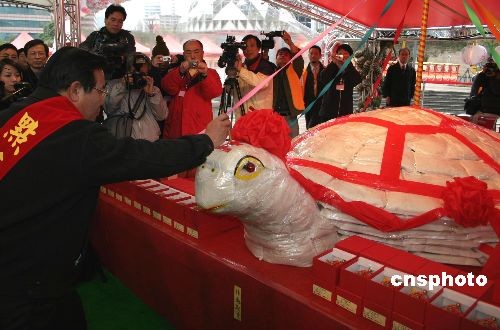二月十五日,二00八臺(tái)北花燈節(jié)開幕,澎湖縣天后宮媽祖受邀前來。按照當(dāng)?shù)刈诮虃鹘y(tǒng),澎湖人員在花燈節(jié)現(xiàn)場造乞龜臺(tái)一座,舉行點(diǎn)青官為“元宵乞龜”點(diǎn)青儀式。中新社發(fā) 徐長安 攝