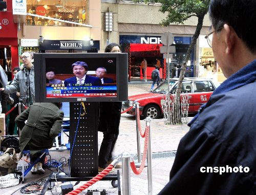 二月二十七日,香港財(cái)政司司長(zhǎng)曾俊華向立法會(huì)提交二零零八至零九年度財(cái)政預(yù)算案,公布政府綜合盈余達(dá)一千一百五十六億元,創(chuàng)歷來新高,并推出多項(xiàng)減稅和惠及社會(huì)的措施。當(dāng)?shù)仉娨暸_(tái)街頭直播曾俊華作報(bào)告,并收集市民意見。中新社發(fā) 王麗南 攝