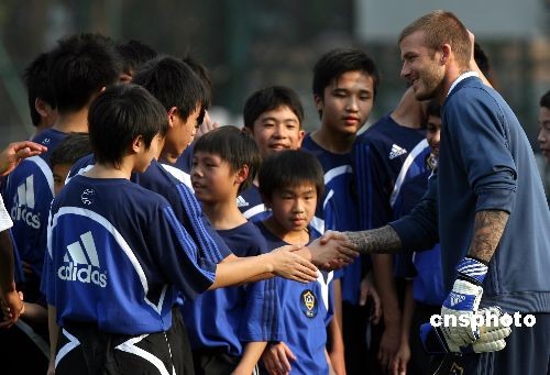 三月七日,英國足球巨星貝克漢姆與洛杉磯銀河隊的隊友在香港指導本地足球小將,推廣足球運動。中新社發(fā) 武仲林 攝