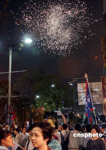 3月22日,中國(guó)國(guó)民黨候選人馬英九、蕭萬(wàn)長(zhǎng)在臺(tái)灣地區(qū)領(lǐng)導(dǎo)人大選中以221萬(wàn)票的領(lǐng)先優(yōu)勢(shì)獲勝。圖為當(dāng)日晚間在馬蕭競(jìng)選總部前的集會(huì)上,支持者放焰火慶祝。中新社發(fā) 黃少華 攝