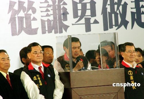 3月22日,臺(tái)灣舉行大選投票,結(jié)果中國(guó)國(guó)民黨候選人馬英九、蕭萬(wàn)長(zhǎng)以221萬(wàn)票的領(lǐng)先優(yōu)勢(shì)獲勝,當(dāng)晚大批支持者在馬蕭競(jìng)選總部前集會(huì)歡慶。圖為馬英九在蕭萬(wàn)長(zhǎng)、國(guó)民黨榮譽(yù)主席連戰(zhàn)、主席吳伯雄、親民黨主席宋楚瑜、“立法院長(zhǎng)”王金平陪同下,在現(xiàn)場(chǎng)發(fā)表演講。中新社發(fā) 黃少華 攝