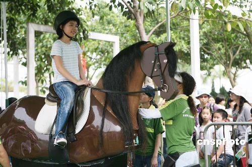 四月六日,香港大埔海濱公園舉行大埔迎奧運(yùn)嘉年華,向市民宣揚(yáng)奧運(yùn)精神,并加深對(duì)香港協(xié)辦的奧運(yùn)馬術(shù)項(xiàng)目的認(rèn)識(shí)與熱愛,中國香港體育協(xié)會(huì)暨奧林匹克委員會(huì)會(huì)長霍震霆、香港民政事務(wù)局局長曾德成等出席活動(dòng)。圖為小朋友通過試騎電動(dòng)馬體驗(yàn)馬術(shù)。 中新社發(fā) 武仲林 攝