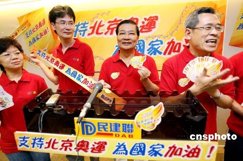 民建聯(lián)歡欣迎接北京奧運四月二十九日,香港民建聯(lián)召開“支持北京奧運 為國家加油”記者會,主席譚耀宗(右二)及中常委展示一系列宣傳品,迎接北京奧運和奧運圣火到來。奧運圣火三十日抵港,五月二日在香港傳遞。中新社發(fā) 洪少葵 攝