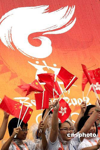 當?shù)貢r間五月二日十點半,2008北京奧運圣火中國境內(nèi)首站香港傳遞正式開始。眾多香港學(xué)生手執(zhí)國旗、區(qū)旗在尖沙咀火炬起跑地歡呼。中新社發(fā) 王麗南 攝