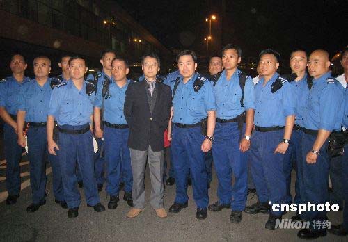 五月十五日凌晨,香港特區(qū)政府派出的二十人搜救隊伍,抵達四川地震災區(qū)協(xié)助搜救工作。搜救隊成員包括消防處特別救援隊十五名消防員及三名救護員,以及衛(wèi)生署一名醫(yī)生及護士。圖為香港特別行政區(qū)政府駐成都經(jīng)濟貿(mào)易辦事處主任陸仿真(中)與搜救隊員合照。中新社發(fā) 中新社/政府新聞處 攝