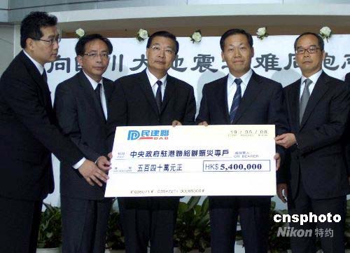 五月十九日,香港民建聯(lián)通過中聯(lián)辦向四川地震災(zāi)區(qū)捐款五百四十萬元港幣。民建聯(lián)主席譚耀宗(右三)及中聯(lián)辦副主任彭清華(右二)等出席儀式。中新社發(fā) 譚達(dá)明 攝