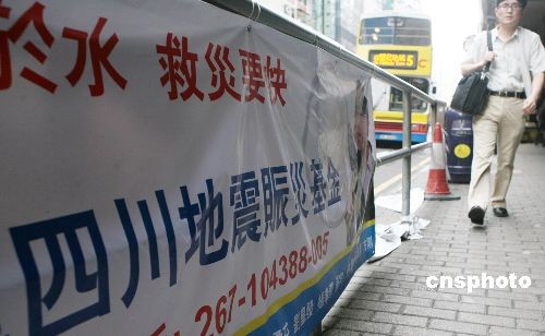 五月二十一日,香港市民走過街頭呼吁各界積極捐款,賑濟(jì)四川地震災(zāi)民的橫幅。香港鳳凰衛(wèi)視此前報(bào)道稱,“有慈善捐款傳統(tǒng)的香港目前的捐款額,據(jù)說全部加起來已經(jīng)超過十五億港元,創(chuàng)下香港的紀(jì)錄。”