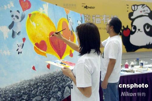 五月三十一日,香港插畫師協(xié)會在商場以義畫、義賣等方式籌款,為四川同胞送愛、送暖。中新社發(fā) 譚達明 攝