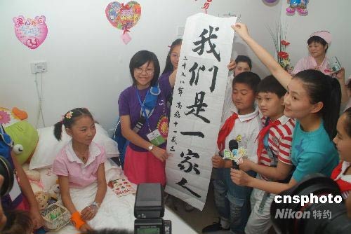 5月31日,“閩臺(tái)少兒心系災(zāi)區(qū)”手拉手活動(dòng)在福州進(jìn)行,來自臺(tái)灣澎湖馬公小學(xué)的80名同學(xué)將陸續(xù)與汶川災(zāi)區(qū)的轉(zhuǎn)院小傷員見面。圖為3名馬公小學(xué)學(xué)生代表來到了南京軍區(qū)福州總醫(yī)院看望災(zāi)區(qū)小朋友林玉如,贈(zèng)送了親手制作的小荷包等禮物,并合唱了一首《童話》。中新社發(fā) 吳志 攝