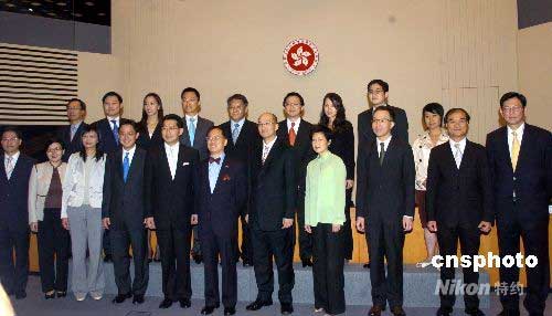 六月十日,香港特區(qū)行政長官曾蔭權(quán)、政制及內(nèi)地事務局局長林瑞麟、行政長官辦公室主任陳德霖、八位新獲委任的副局長及九位政治助理下午一起會見新聞界。中新社發(fā) 譚達明 攝