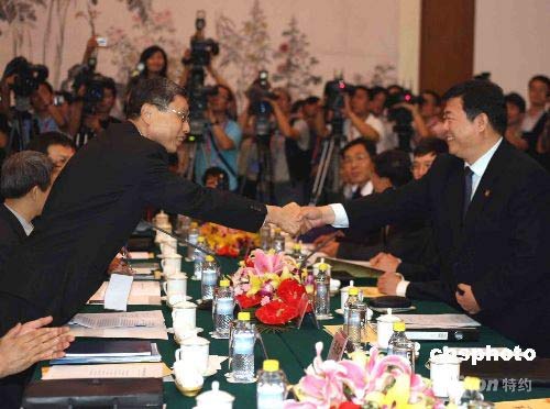 6月12日上午,海峽兩岸關(guān)系協(xié)會副會長孫亞夫(右)與臺灣海峽交流基金會副董事長高孔廉在北京釣魚臺5號樓協(xié)商兩岸周末包機。中新社發(fā) 任晨鳴 攝