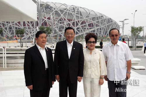 6月12日下午,海峽交流基金會(huì)董事長(zhǎng)江丙坤參觀了北京奧運(yùn)會(huì)場(chǎng)館,圖為江丙坤等人在“鳥巢”前留影。中新社記者 張宇 攝