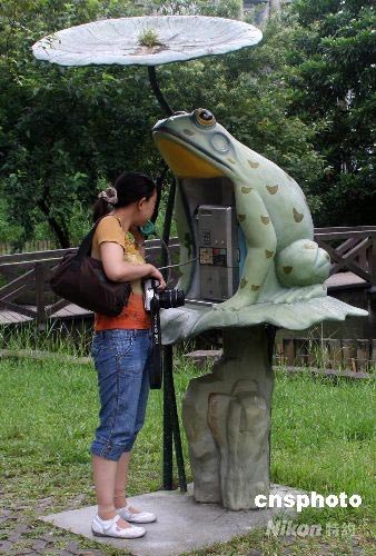 6月16日,一游客在臺北植物園新設置的“青蛙與荷葉傘”電話亭打電話。臺北植物園已有百年歷史,占地八公頃,種植有近兩千種植物,被臺灣中小學生視為植物博物館和植物樂園。中新社發(fā) 耿軍 攝