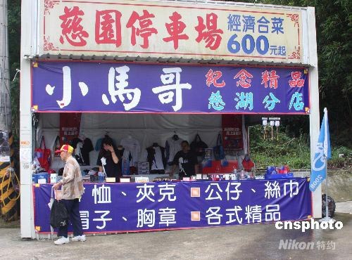 臺(tái)灣旅游業(yè)界為迎接大陸居民赴臺(tái)旅游,已開始做各項(xiàng)準(zhǔn)備工作。圖為臺(tái)灣桃園縣經(jīng)營旅游商品的商販,在慈湖蔣介石陵寢的路邊,設(shè)立了招攬大陸游客的、專售與馬英九相關(guān)的旅游紀(jì)念品的商棚。中新社發(fā) 耿軍 攝