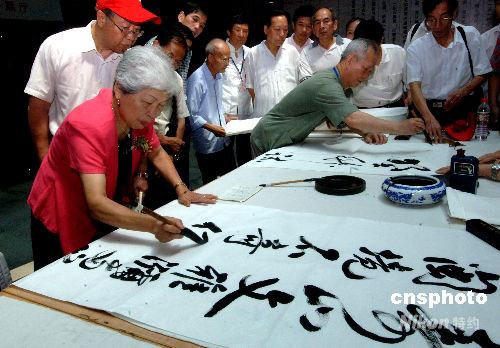 6月19日,參加海峽兩岸壽山石文化書法精品展的兩岸知名書法家,在福州博物館舉行交流筆會。圖為臺灣中國書法家學(xué)會理事長謝季蕓女士(左一)、臺灣中國書法家學(xué)會副理事長陳炫明在海峽兩岸書法家交流筆會上揮毫。中新社發(fā) 劉可耕 攝