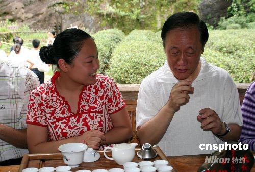 六月十九日下午,在福建參加“六·一八”項目成果交易會的臺灣新黨主席郁慕明來到武夷山參觀考察。圖為郁慕明在當(dāng)?shù)刂鑸@大紅袍景點學(xué)習(xí)武夷茶藝。中新社發(fā) 周文杰 攝