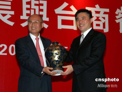 6月25日晚,臺北市長郝龍斌在上海與臺商餐敘時,贊賞臺商不僅在家鄉(xiāng)有愛心,在大陸也一樣有愛心,特別是此次四川地震發(fā)生后,臺商踴躍賑災精神可嘉。圖為郝龍斌與上海臺商協(xié)會會長李茂盛互贈禮品。