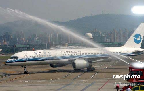 七月四日八時三十八分,兩岸周末包機(jī)大陸福建首發(fā)團(tuán)乘坐廈門航空公司B757客機(jī)抵達(dá)臺北松山機(jī)場。松山機(jī)場以噴水儀式為首發(fā)團(tuán)接風(fēng)洗塵。中新社發(fā) 徐長安 攝