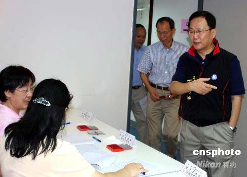 7月26日,中國國民黨舉行中常委選舉投、開票。國民黨籍“立法委員”丁守中(右),第一個(gè)來到位于臺(tái)北市議會(huì)的投票所登記參加投票。中新社發(fā) 董會(huì)峰 攝