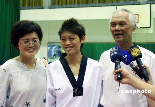 中華臺(tái)北隊(duì)選手們目前正在高雄左營訓(xùn)練中心加緊訓(xùn)練,準(zhǔn)備以最好的狀態(tài),備戰(zhàn)北京奧運(yùn)。圖為跆拳道隊(duì)員蘇麗文(中)與父母接受媒體采訪。其父母表示屆時(shí)將赴北京,到現(xiàn)場(chǎng)為女兒加油。中新社發(fā) 黃少華 攝