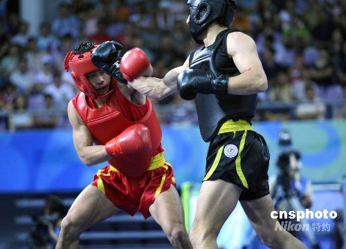 8月24日,在北京2008武術(shù)比賽男子70公斤級散手決賽中,中國澳門選手蔡良蟬(紅方)戰(zhàn)勝俄羅斯選手穆拉德·阿哈多夫,獲得冠軍。當(dāng)日,北京2008武術(shù)比賽落下帷幕。中新社發(fā) 宋吉河 攝